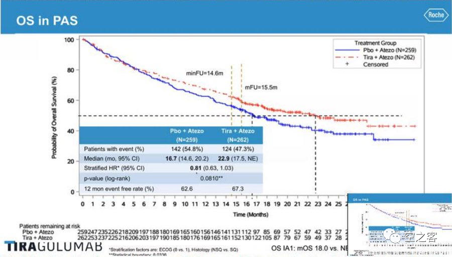 在本次的不经意披露中,在15.5个月的中位随访期中,Tira+Atezo组的OS尚未达到、预期为22.9个月,而Atezo组的OS是16.7个月,HR=0.81 [95% CI: 0.63, 1.03]。