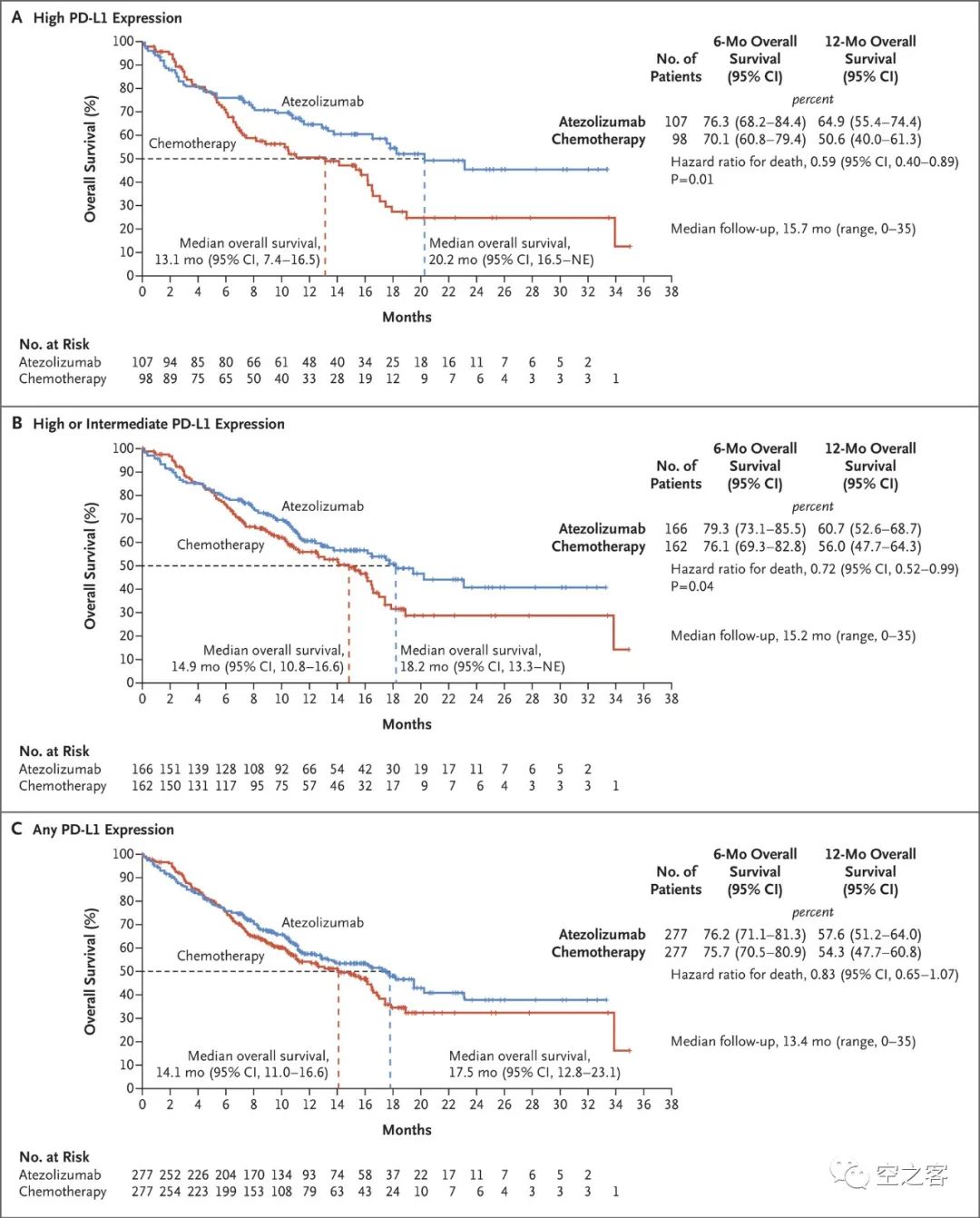 另一个则是硬桥硬马的Tecentriq(同时作为SKYSCRAPER-01试验的对照组),在PD-L1高表达组,OS对比是20.2 vs 13.1个月(HR=0.59 [0.40, 0.89],p=0.01),PFS对比是8.1 vs 5.0个月(HR=0.63 [0.45, 0.88]);更别提诸如K药这种干净利索的对照结果了。