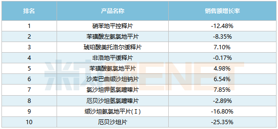 高血压用药产品TOP10中,10个产品销售额均超过10亿元。硝苯地平控释片连续四年位列第一,以超过58亿元的销售额遥遥领先;苯磺酸左氨氯地平片、琥珀酸美托洛尔缓释片分别位列第二、第三,销售额均超过30亿元;从销售额增速上看,3个产品跌逾10%,厄贝沙坦片大跌25.35%、缬沙坦氨氯地平片(Ⅰ)大跌16.80%、硝苯地平控释片大跌12.48%。