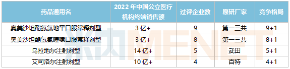 米内网数据显示,4个品种2022年在中国公立医疗机构终端销售规模合计超过31亿元。其中,2款静脉降压药乌拉地尔注射剂、艾司洛尔注射剂销售额均超过10亿元;2款复方降压药奥美沙坦酯氨氯地平口服常释剂型、奥美沙坦酯氢氯噻嗪口服常释剂型销售额均超过3亿元,原研厂家均为第一三共。