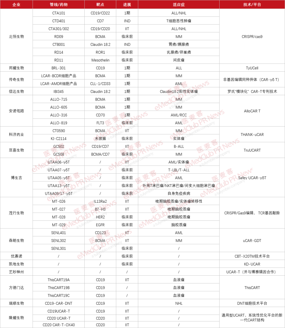 2023年8月24日/医麦客--星耀研究院新闻 PharmaBIGStar News/--目前,自体CAR-T疗法已经在血液瘤中取得了重大突破,但同时也面临着回输时间长、价格昂贵、患者负担重等问题。为提升产品的可及性,降低成本并节约时间,研发通用型CAR-T疗法已经是行业内的共识之一。本文整理了国内16家布局通用型CAR-T疗法的企业及各家的最新进展(排名不分先后,欢迎参加通用细胞大会)。