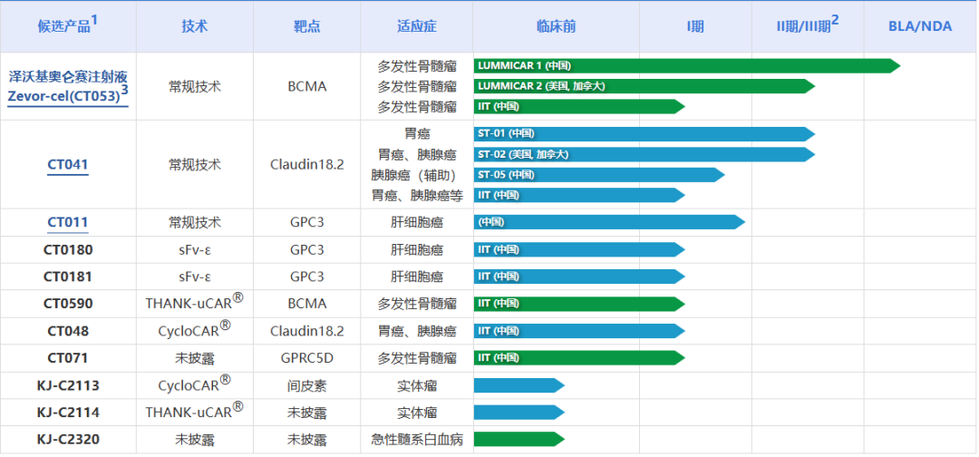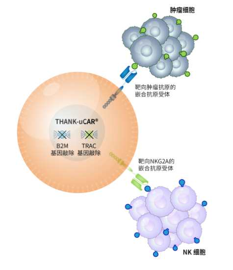 THANK-uCAR®平台技术能够将一种识别NK细胞表面蛋白NKG2A的CAR被装载到同种异体CAR-T细胞中,以阻止宿主NK细胞的攻击。其数据表明,在NK细胞存在的情况下,THANK-uCAR®T细胞比TCR/B2M双敲除的同种异体T细胞能更好地存活和增殖。据官网显示,基于该平台研发的同种异体CAR-T疗法CT0590处于IIT临床研究阶段,KJ-C2114尚处于临床前。