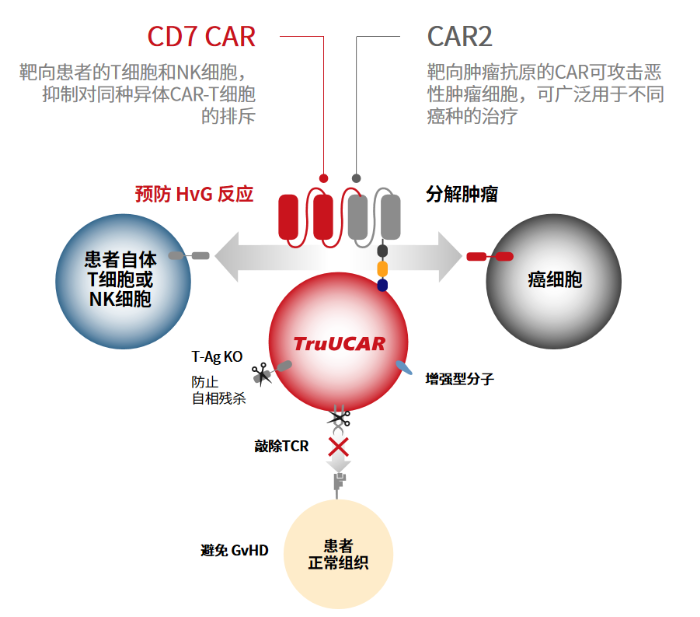 另外,TruUCAR的模块化平台提供了设计上的灵活性,能够针对不同抗原,调整、替换CAR的构型。例如,抗HvG和抗GvHD功能可以通过双特异CAR设计或单CAR设计来实现双特异性功能。双CAR情况下两种CAR实行不同的功能,单CAR则执行双重功能。值得一提的是,产品设计中还会将一个增强型分子嵌入到TruUCAR的基础结构中,以提升TruUCAR T细胞的扩增能力。