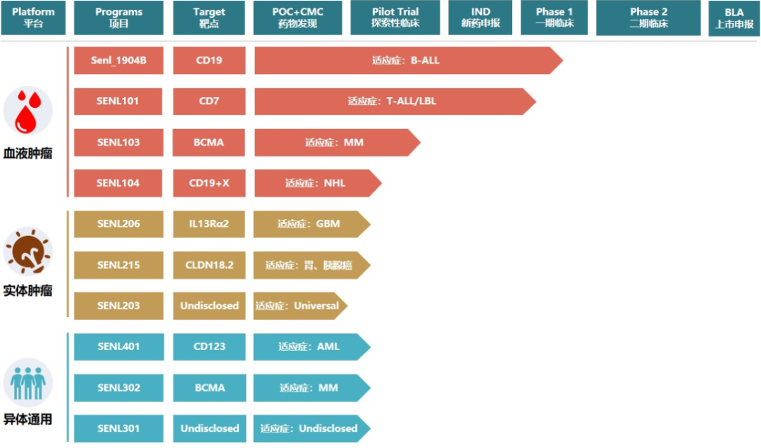 森朗生物成立于2016年,是专注于创新型免疫细胞治疗药物研发、应用的高科技生物医药企业。森朗生物针对自体CAR-T细胞产品所存在不足,建立了以Senl_uγδT-123产品为代表的通用CAR-T技术平台,希望解决目前自体CAR-T细胞应用的限制性,以降低产品成本,追求同种异体细胞疗法的潜在效益。目前,森朗生物建立了多条同种异体CAR-T管线,目前大部分还处于IIT和临床前研究阶段。