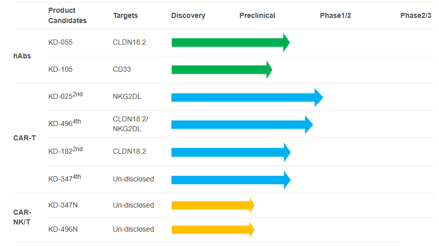 凯地生物KD-025 CAR-T的IIT临床试验已完成多例低剂量给药,无明显毒副反应,产品安全有效,该管线已获得国内首个靶向NKG2DL治疗实体瘤的IND临床批件,正在启动临床1期研究。另外,KD-496作为全球首个靶向NKG2DL/CLDN18.2的CAR-T细胞治疗产品已进入IIT临床阶段。
