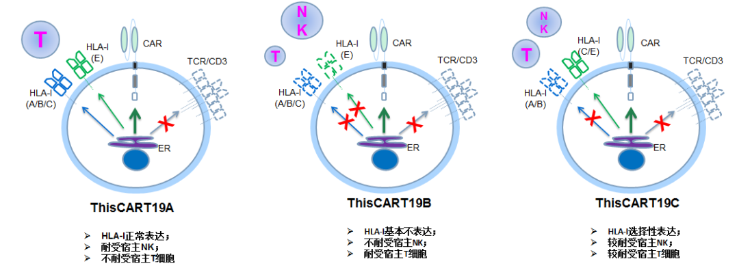 目前方德门达有3款产品聚焦血液肿瘤:ThisCART-A/B/C。这三款相当于逐步优化,其中ThisCART-A通过膜蛋白胞内滞留技术下调T细胞表面的TCR/CD3复合物,避免GvHD,但该产品存在HLA-I类分子,易受宿主T细胞的攻击排斥;ThisCART-B通过膜蛋白胞内滞留技术下调T细胞表面的TCR/CD3复合物和HLA-I类分子,但该产品易受宿主NK细胞的攻击排斥;ThisCART-C通过膜蛋白胞内滞留技术下调T细胞表面的TCR/CD3复合物和选择性下调HLA-I类分子以较好地耐受宿主T细胞和NK细胞的攻击排斥。