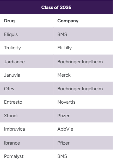 意味着有5款药将跌出TOP10,分别为:辉瑞的抗凝血剂Eliquis、艾伯维的自免药修美乐、强生的自免药喜达诺、礼来的心血管药恩格列净、再生元的眼科药物艾力雅。主要都是因为专利到期。