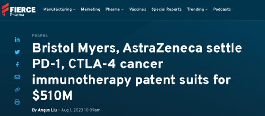 1.Bristol Myers,AstraZeneca settle PD-1,CTLA-4 cancer immunotherapy patent suits for $510M. FiecerPharma.