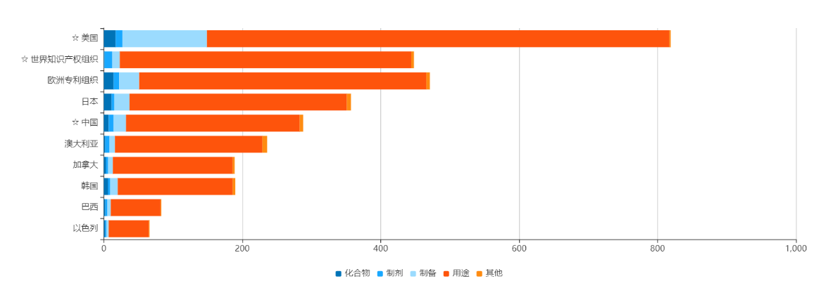 图2. Opdivo在不同国家/地区的专利及类别数量,来源:药渡数据库