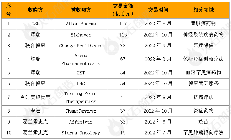 企业竞合出现新模式。生物医药巨头加速管线整合,金融投资成为产业发展关键驱动力。2022年全球TOP10并购事件总额达616亿美元,头部企业重点加大在肾脏病药物、神经系统疾病药物、炎症药物、罕见病药物、疫苗以及健康管理服务等领域的布局。