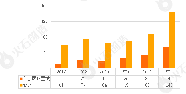 2017-2022 我国创新医疗器械和新药获批情况 来源:火石创造产业数据中心