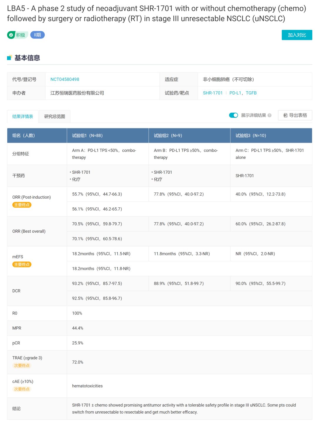 据 Insight 数据库显示,SHR-1701 目前暂未公布 III 期临床数据,不过已有 2 条 II 期临床试验结果(不含 I/II 期)收录,分别针对食管鳞癌和非小细胞肺癌。其中针对非小细胞肺癌的 II 期临床结果以 LBA 的形式在 2022 ESMO 发布: