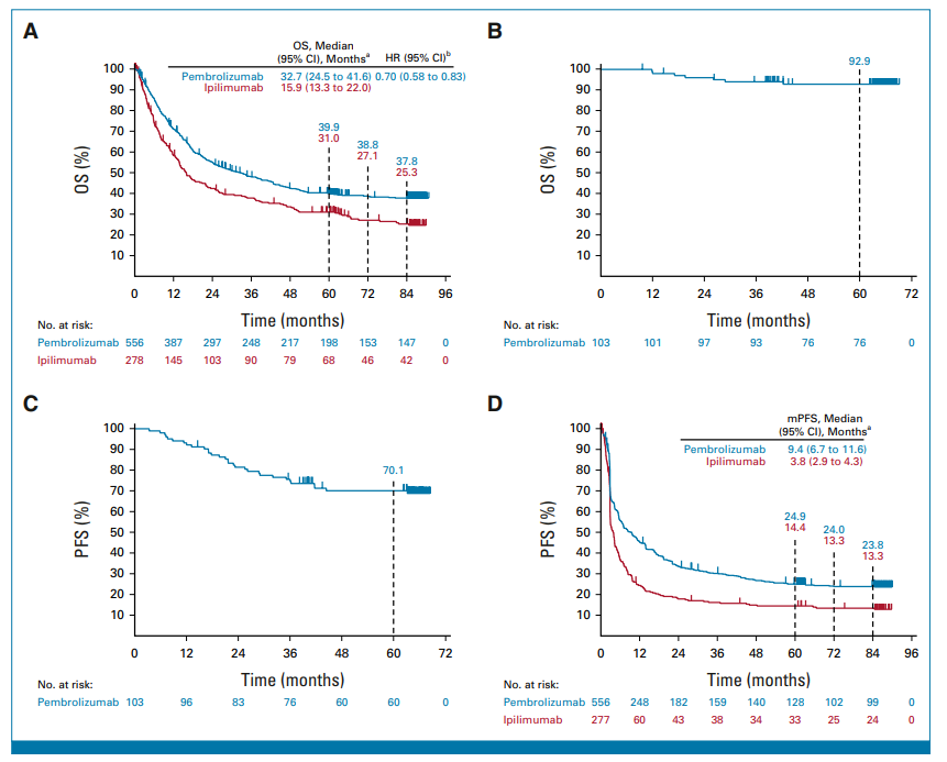 1. Seven-Year Follow-Up of the Phase III KEYNOTE-006 Study: Pembrolizumab Versus Ipilimumab in Advanced Melanoma. J Clin Oncol. 2023 Aug 20;41(24):3998-4003. doi: 10.1200/JCO.22.01599. Epub 2023 Jun 22.