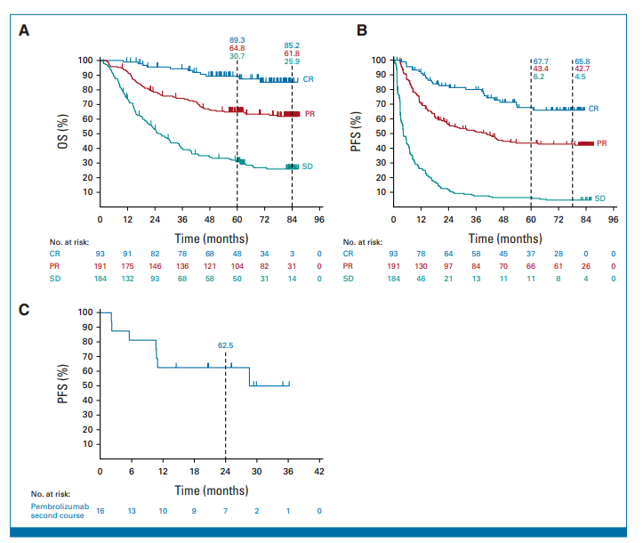 研究中,帕博利珠单抗组中 93 例患者(16.7%)完全缓解(CR),191 例(34.4%)部分缓解(PR),184 例患者(33.1%)保持稳定(SD)。以 CR/PR/SD 疗效分组随访结果,不出意外的无论是 PFS 和 OS,CR 疗效最优,PR 次之,SD 最差,三组的 7 年 OS 率分别为 85.5% VS. 61.8 % VS. 25.9%(上图 A),7 年 PFS 率为 65.8% VS.42.7 % VS. 4.5%(上图 B)。16 例患者接受了帕博利珠单抗第二疗程的治疗,其 2 年 PFS 为 62.5%(上图 C),在第一轮治疗中取得 CR 或 PR 的患者相对治疗结果 SD 的患者接受帕博利珠单抗二次疗程治疗的效果会更好。