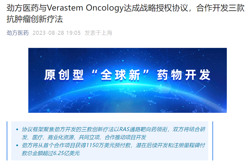 8月29日,劲方医药宣布与Verastem达成独家授权及早期合作开发协议。Verastem将作为独家合作伙伴,获得三款由劲方开发、以RAS通路靶向药领衔的创新疗法在大中华区(包括中国大陆、香港、澳门、台湾)之外的全球开发和商业化权利。