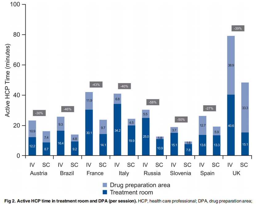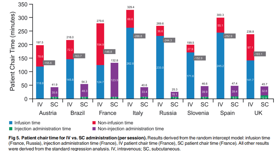 相较于SC,患者去医院接受治疗过程更是“一场漫长的等待”。一项横跨八个国家的研究显示[1],在不同国家的非霍奇金淋巴瘤患者中,接受利妥昔单抗IV患者的平均“坐椅时间”(Chair time)为262.1分钟,而SC的平均时间为67.3分钟,减少了74%(p<0.0001)。