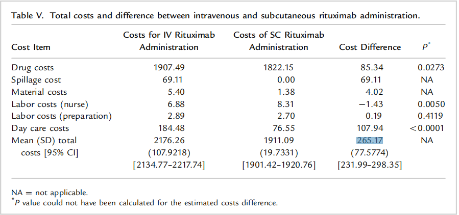 除了时间成本外,相较于SC,患者因去医院接受IV治疗而产生的医疗费用更是一笔巨大的开支。IV需要额外的溶液和输注装置、耗材等,也更容易造成资源的浪费。一项观察性研究表明[2]:利妥昔单抗IV和SC剂型平均每次的治疗费用差异高达265.17欧元(95% CI, €231.99-€298.35)。