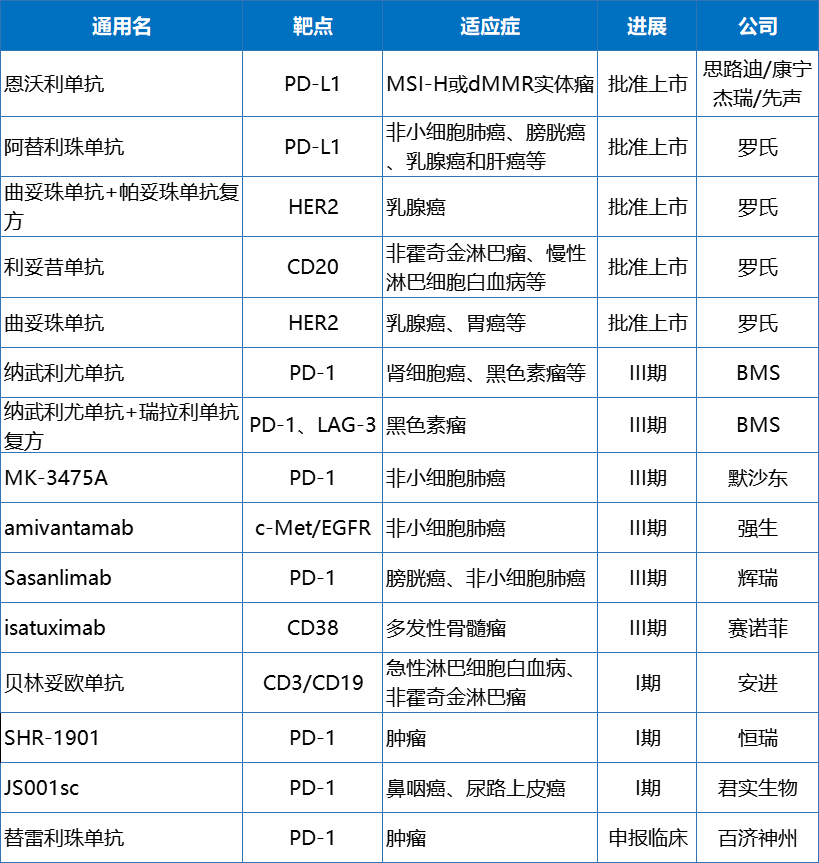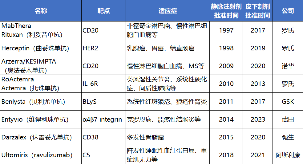 全球获批上市/在研皮下注射型抗肿瘤单抗药物