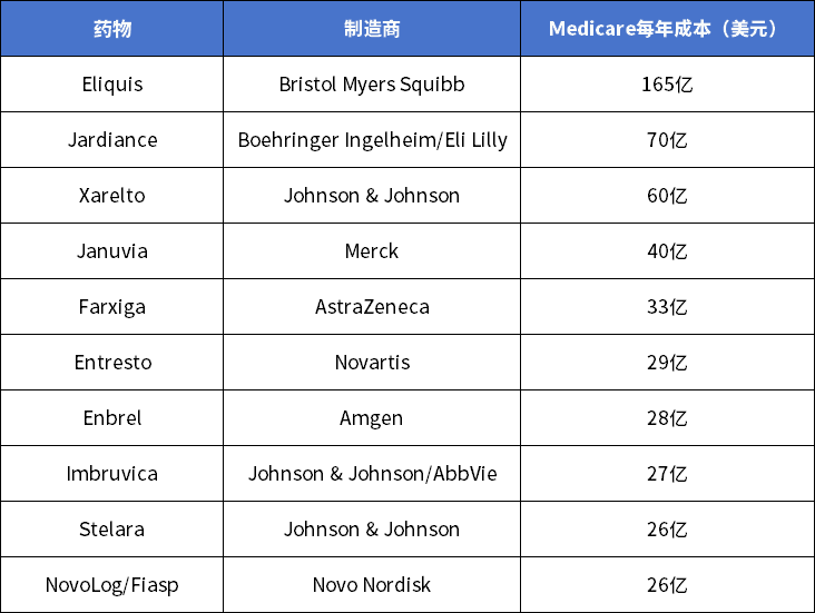 表1 美国联邦政府选定10种参与价格谈判药物清单