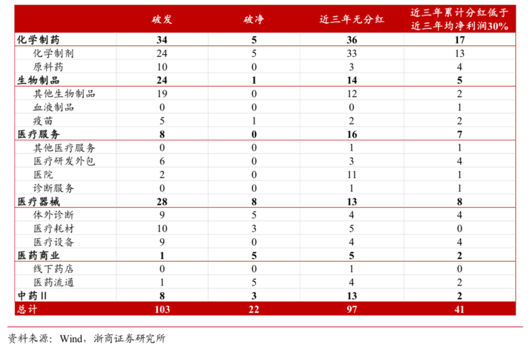 根据浙商证券的统计,参考8月28日收盘价,A股所有医药行业股,破发的个股共103支,破净个股22支,近三年无分红个股97支,近三年有分红但累计分红低于近三年均净利润30%的个股共41支。