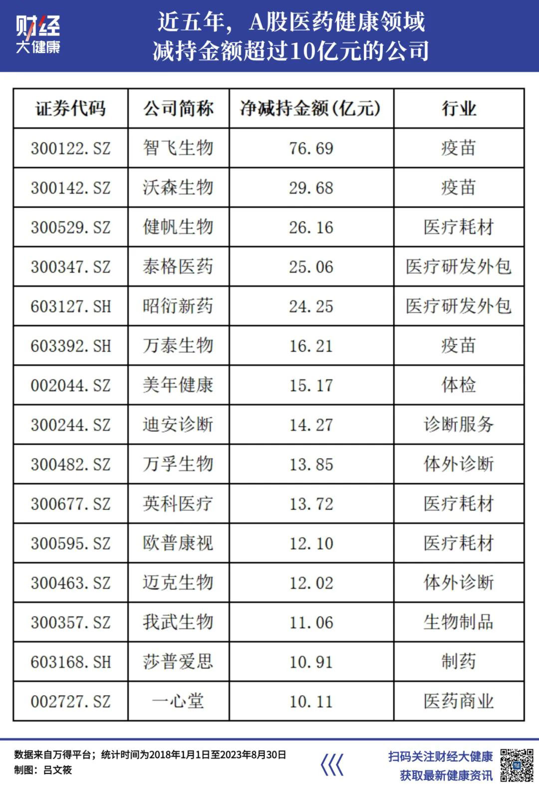 排在头两位的均为疫苗企业。智飞生物近五年的减持,集中在控股股东、实控人蒋仁生,以及副总裁蒋喜生。