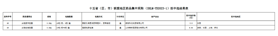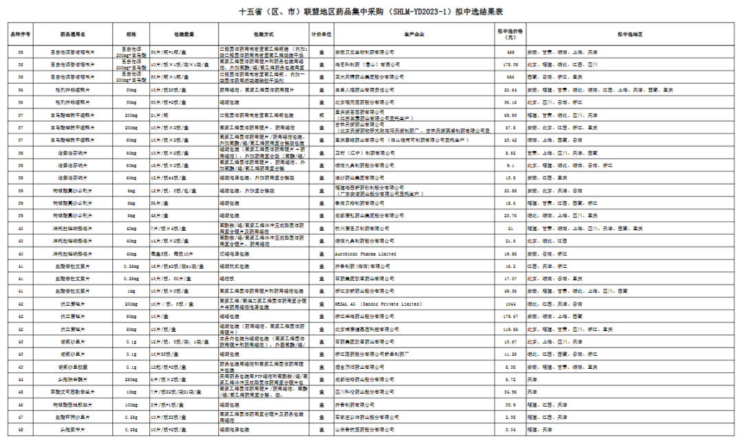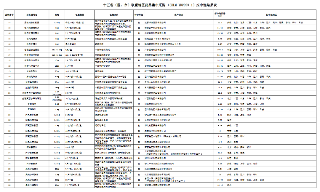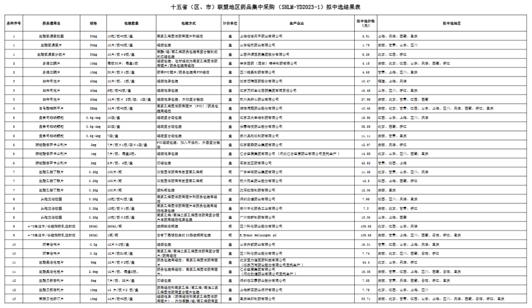 十五省(区、市)联盟地区药品集中采购拟中选结果表