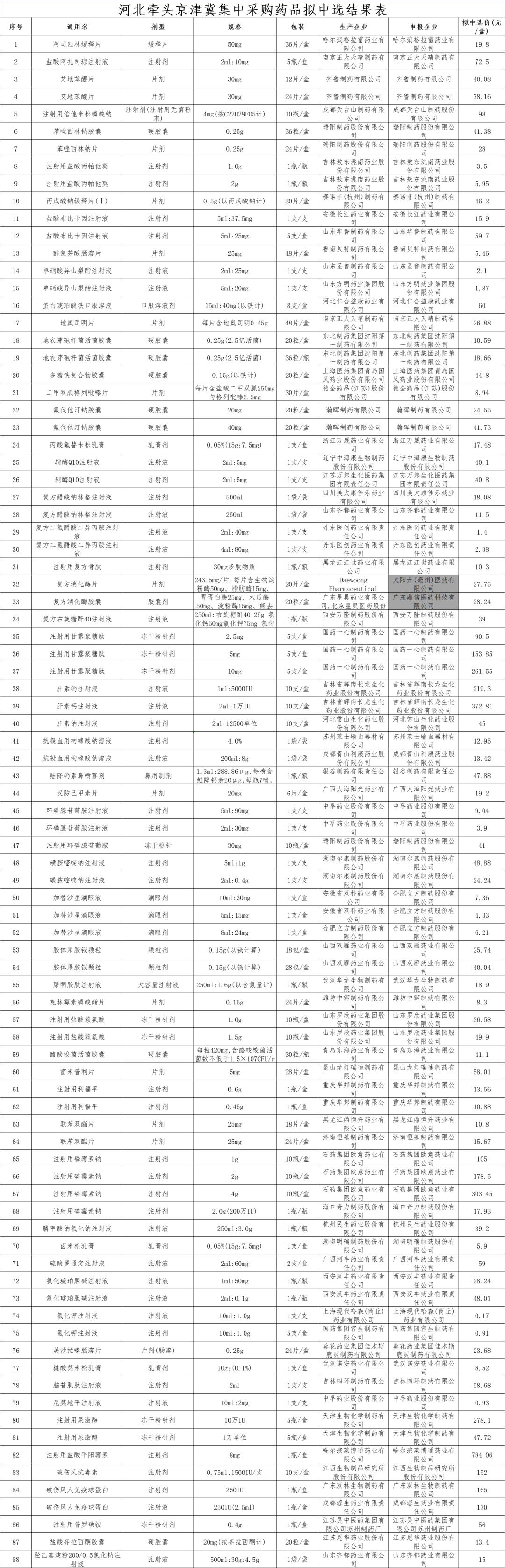 河北牵头京津冀集中采购药品拟中选结果表