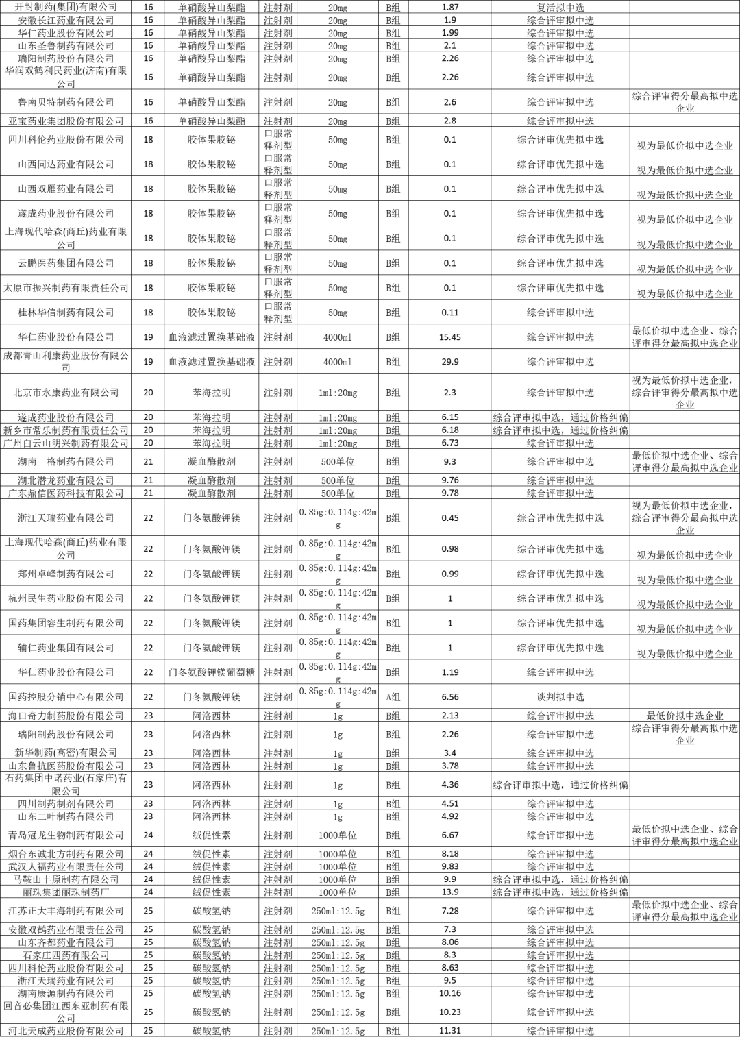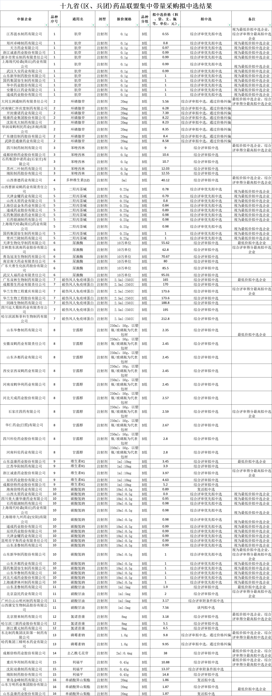 十九省(区、兵团)药品联盟集中带量采购拟中选结果