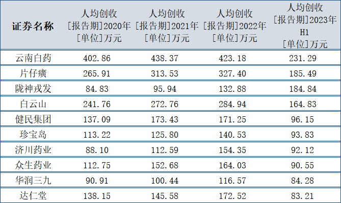纵观人均创收TOP10的中药公司,要么有“老字号”属性加持,如云南白药、片仔癀、达仁堂等;要么有“医药商业”的成分较重,如白云山;要么兼而有之。