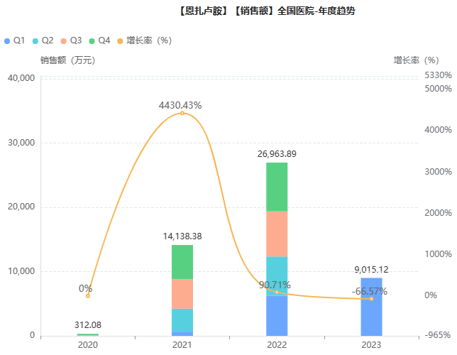 2020年恩扎卢胺通过国家医保谈判降价78%进入医保乙类目录,挂网价为69.6元(40mg),其市场也被快速打开。2021年院内销售额便已突破亿元大关;2022年达2.7亿元,同比增长90%。