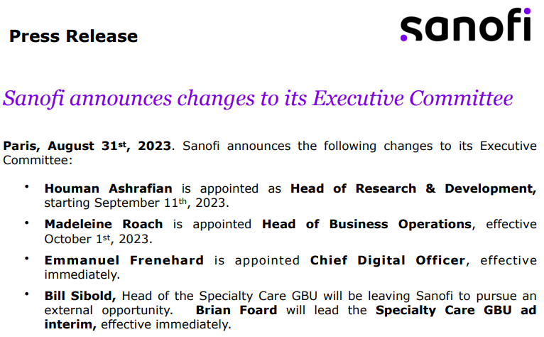 8月31日,赛诺菲宣布其执行委员会发生以下变动:Houman Ashrafian被任命为研发主管,自2023年9月11日起生效。Madeleine Roach被任命为业务运营总监,自2023年10月1日起生效。Emmanuel Frenehard被任命为首席数字官,立即生效。Houman、Madeleine和Emmanuel将向赛诺菲首席执行官Paul Hudson汇报工作,常驻法国巴黎。