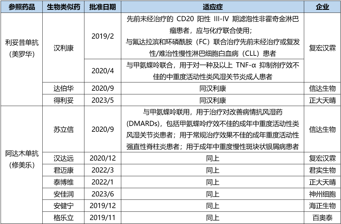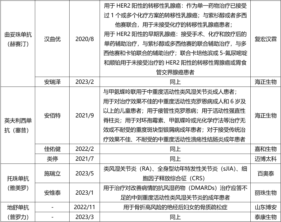 表1. 单抗类生物类似药上市品种汇总,来源:NMPA,截至2023年6月30日