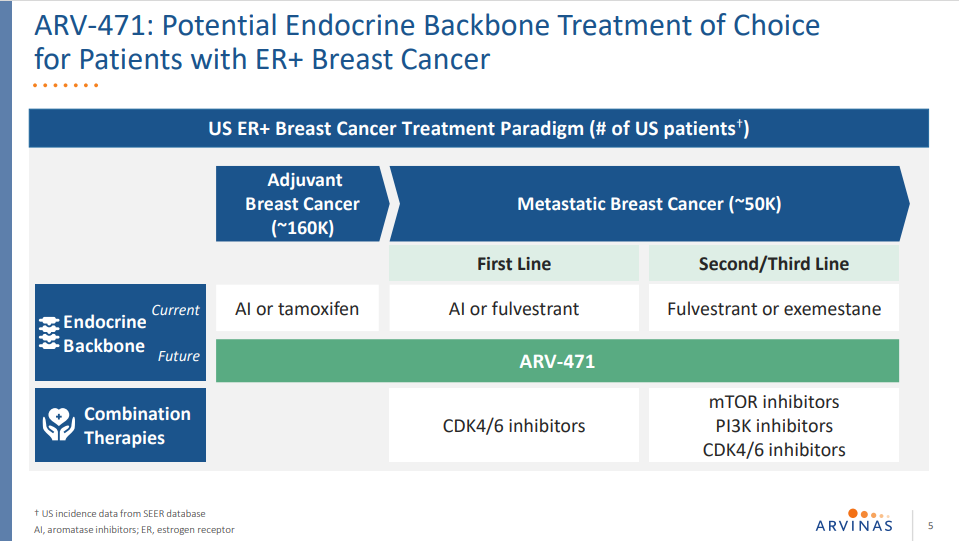 基于ARV-471在早期临床试验中的亮眼数据,2021年7月,辉瑞公司与Arvinas达成了一项合作,以共同开发和推广ARV-471。此次合作的目标是将ARV-471打造为治疗ER阳性乳腺癌患者的支柱性内分泌疗法,覆盖从接受辅助治疗的乳腺癌患者到转移性乳腺癌患者的所有ER阳性乳腺癌患者群体。目前,ARV-471已进入3期临床研究。