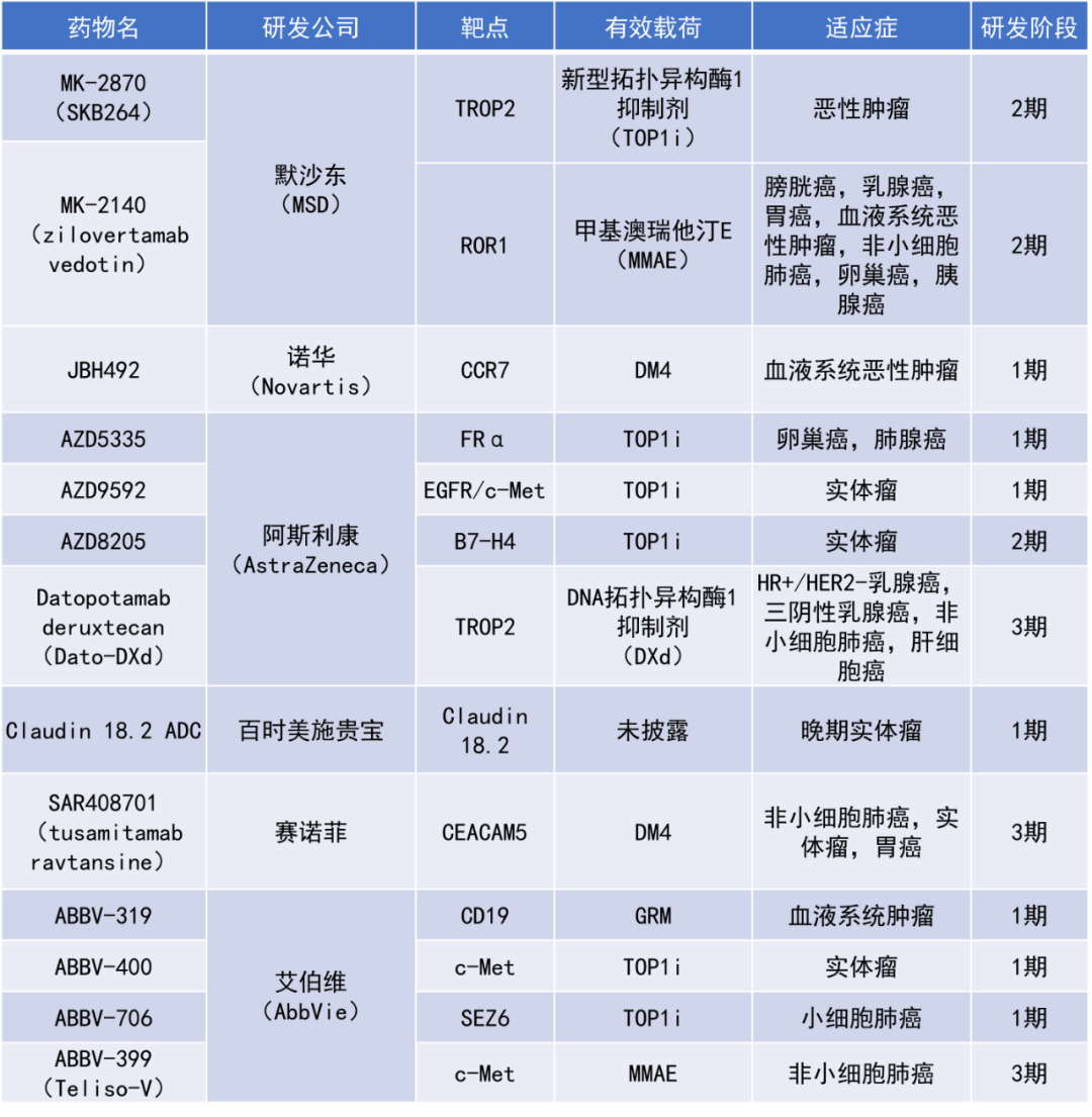 目前,2022年研发投入最多的十家药企共有7款ADC处于1期临床研究阶段,3款处于2期临床研究阶段,此外还有3款ADC已经在3期临床试验中进行测试。在这些ADC中,针对的靶点主要集中在c-Met和TROP2上,分别有3款和2款ADC针对这些靶点。