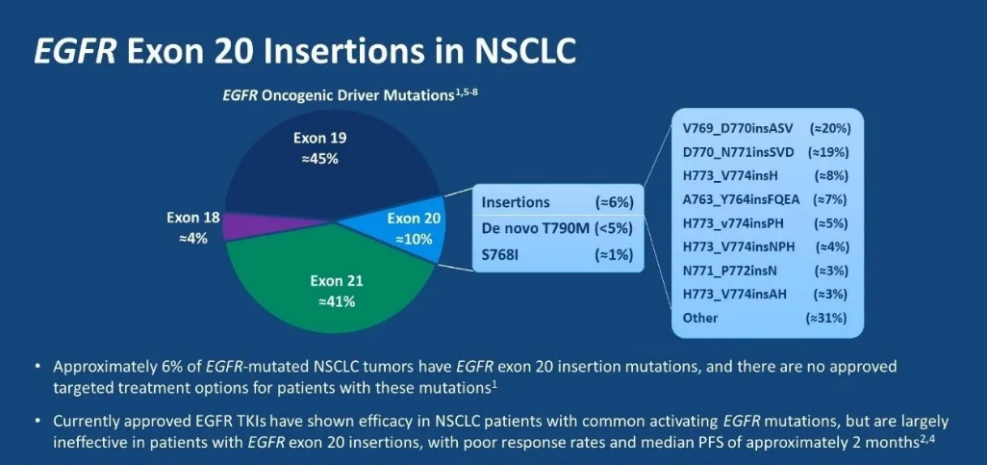 莫博替尼的上市基于EXKIVITY 1/2 期试验的积极结果,114名经过铂类治疗的EGFR Exon20+非小细胞肺癌患者接受mobocertinib的治疗。独立评审委员会评估的整体缓解率为28%,患者中位无进展生存期为7.3个月,中位总生存期 (OS) 为 24 个月。