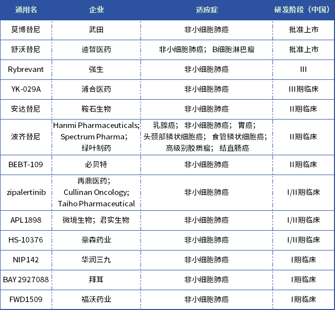 目前,莫博替尼和舒沃替尼在国内获批用于EGFR EX20ins NSCLC的治疗,埃万妥单抗处于临床Ⅲ期。一批国产创新药企业亦在这一赛道你追我赶,艾力斯、浦合医药、鞍石生物、贝达药业等临床进展居前。