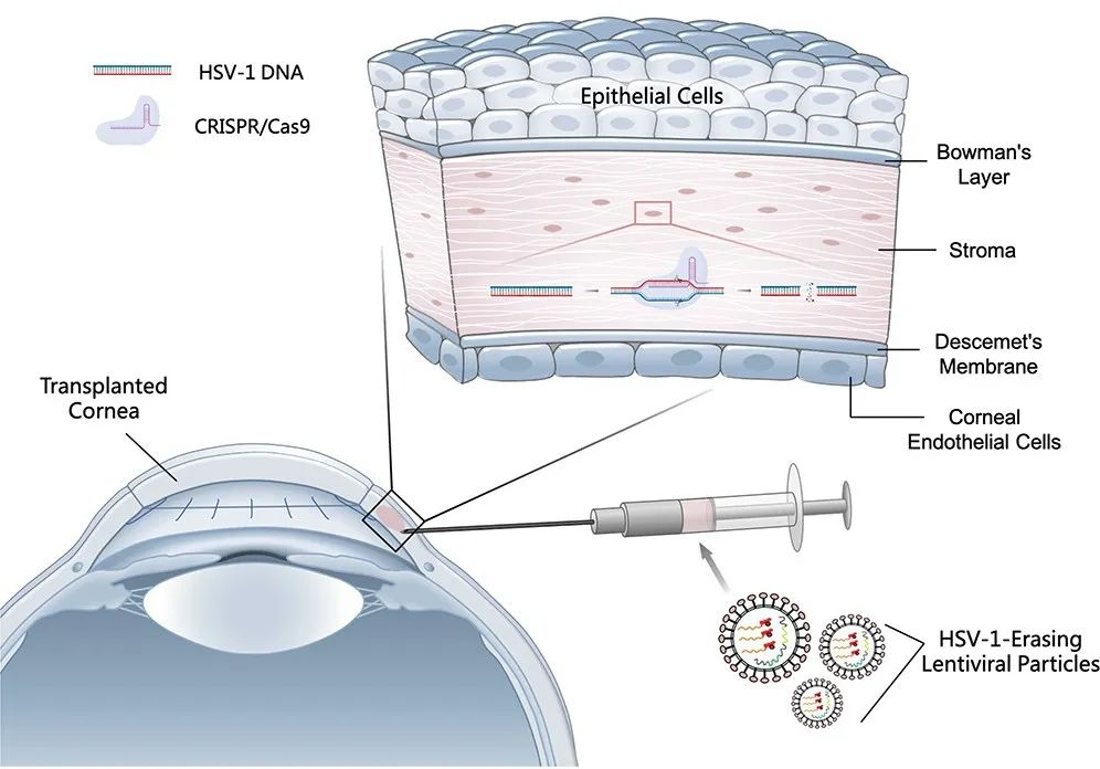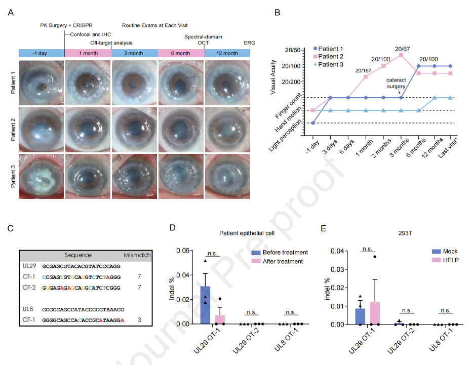 该研究对3名伴有急性角膜穿孔的严重难治性单纯疱疹病毒性角膜炎(HSK)患者进行了HELP治疗联合角膜移植,并进行了平均18个月的随访。结果显示,3名患者的未发生HSV-1复发,且没有检测到CRISPR诱导的脱靶效应,也未出现全身性不良事件。