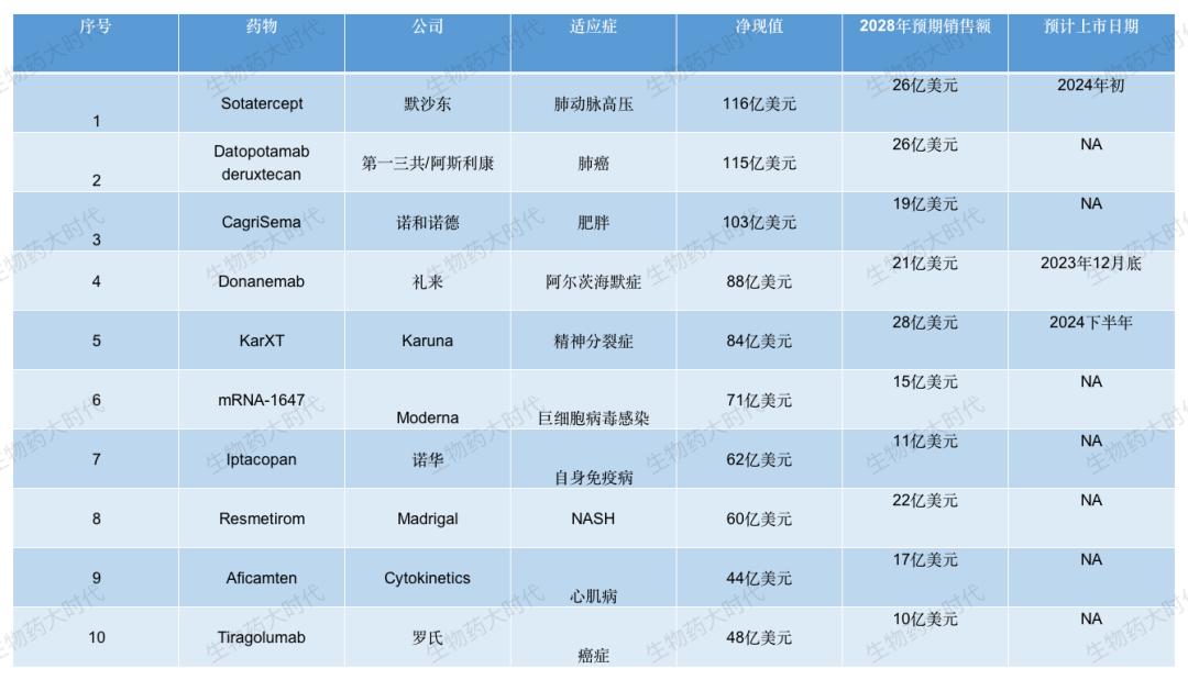 以下十大最有价值的项目的净现值为791亿美元,到2028年,全球潜在产品总收入将达到194亿美元。