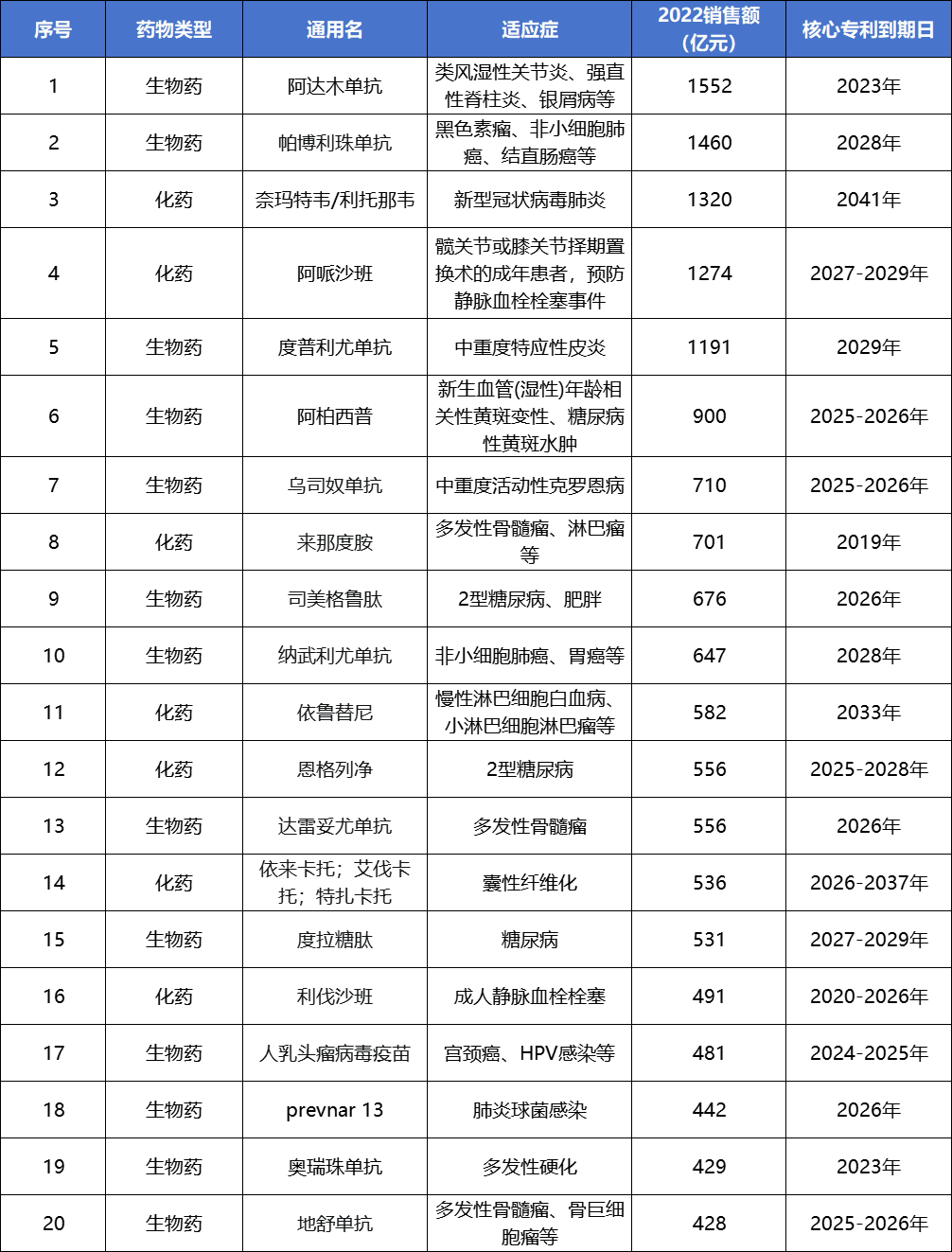 因此,这里笔者整理了2022年全球药品销售额TOP20产品市场数据及专利到期时间,以供医药企业立项参考。