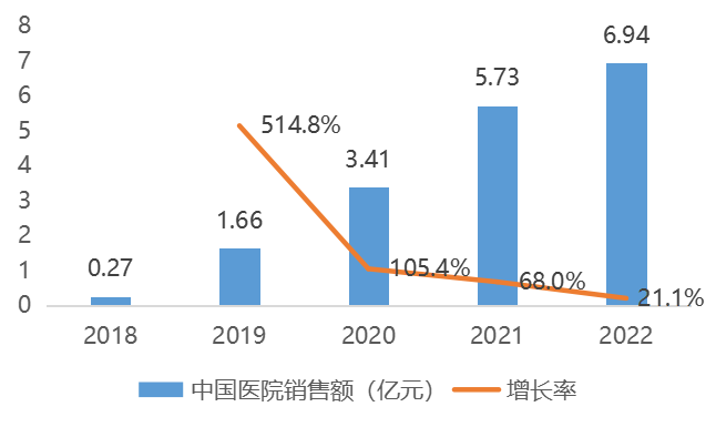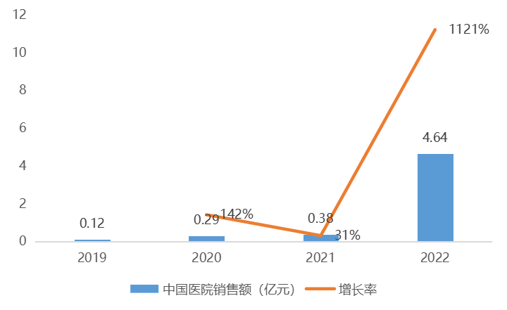 2019-2022年,乌司奴单抗中国医院销售额逐年增长,近3年复合增长率达238.2%,2021年该产品医保谈判成功,于2022年1月1日正式纳入国家医保目录并实施,这也使得其在2022年的增长率达到了1121%,销售额由0.38亿元增长至4.64亿元。