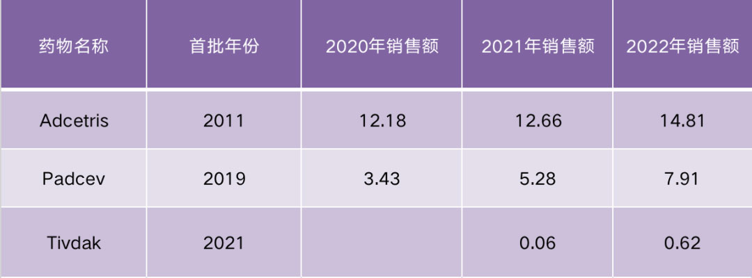 Adcetris、Padcev、Tivdak全球销售额变化(单位:亿美元,药渡)