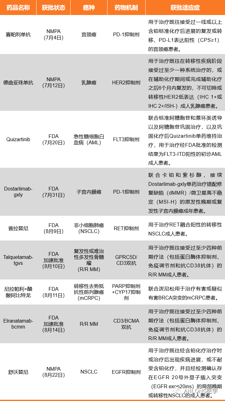 据公开资料显示,2023年7-8月,NMPA批准了包含靶向HER2的ADC药物-德曲妥珠单抗、EGFR抑制剂-舒沃替尼等在内的3项肿瘤药物适应症,FDA也批准了多达6项肿瘤药物适应症。详细7-8月获批上市药物及药物新获批适应症见下文。