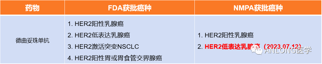 7月12日,阿斯利康(AstraZeneca)和第一三共(Daiichi Sankyo)宣布,双方联合开发和商业化的靶向HER2的ADC药物-德曲妥珠单抗获得NMPA正式批准,本品单药适用于治疗既往在转移性疾病阶段接受过至少一种系统治疗的,或在辅助化疗期间或完成辅助化疗之后6个月内复发的,不可切除或转移性HER2低表达成人乳腺癌患者。