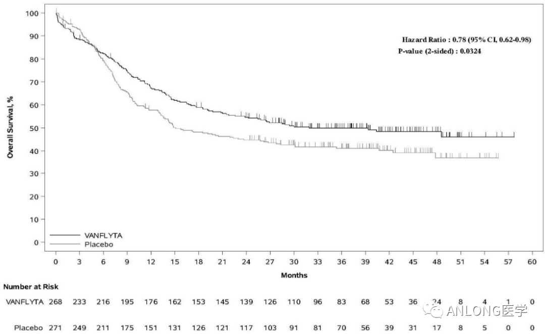 结果显示,在中位随访39.2个月时,Quizartinib组的中位OS为31.9个月,而安慰剂组为15.1个月,这表明Quizartinib联合化疗在携带FLT3-ITD突变的AML成人患者中实现了显著的OS获益。
