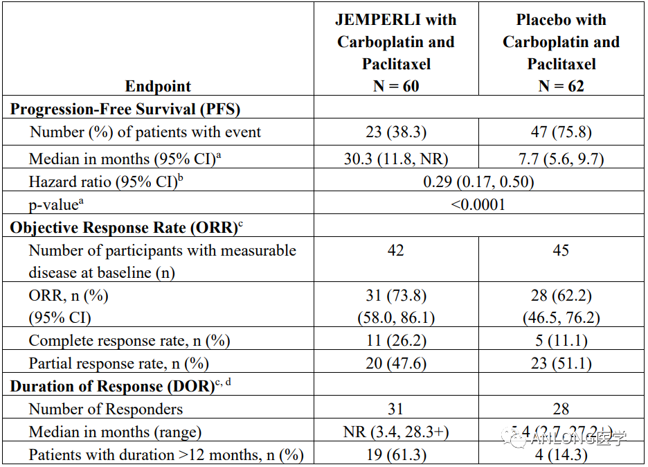 临床数据:本次获批主要是基于III期RUBY研究(NCT03981796)期中分析结果。结果显示,在超过25个月中位随访时间内,该试验达到了研究者评估的PFS主要终点,接受Dostarlimab-gxly组合疗法的dMMR/MSI-H患者,中位PFS为30.3个月,对照组的中位PFS为7.7个月。结果表明,接受Dostarlimab-gxly联合卡铂和紫杉醇治疗的dMMR/MSI-H患者的PFS在统计学意义和临床意义上延长。此外,患者经治后,疾病进展或死亡风险降低了71%。意向性治疗(ITT)人群的OS是该研究的另一共同主要终点,目前正在评估中。