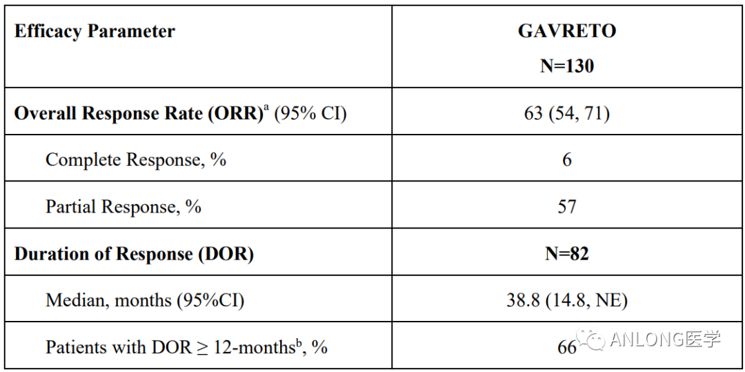 临床数据:ARROW试验共纳237例局部晚期或转移性RET融合阳性NSCLC患者,所有患者接受普拉替尼治疗,直到疾病进展或出现不可接受的毒性。在107例初治患者中,ORR为78%,中位DoR为13.4个月。在既往接受铂类化疗的130例患者中,ORR为63%,中位DoR为38.8个月。