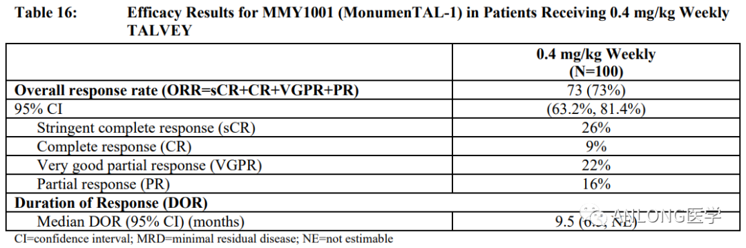 临床数据:本次获批是基于MonumenTAL-1的I/II期临床研究,该试验纳入了既往接受过至少4线治疗且既往未接受过T细胞重定向治疗的患者(n=187),结果显示了有意义的ORR。在每两周一次0.8 mg/kg皮下(SC)注射剂量下,73.6%的患者达到ORR。在每周一次0.4 mg/kg SC剂量下,73.0%的患者达到ORR。