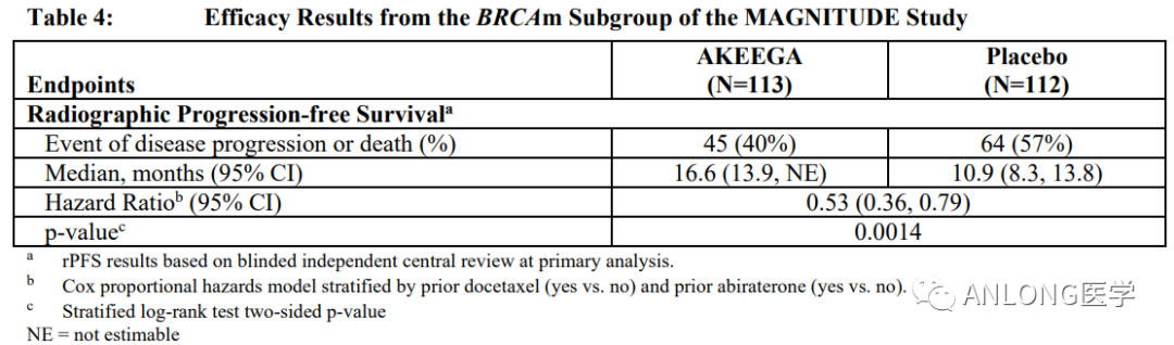 临床数据:本次批准是基于III期MAGNITUDE研究的结果。MAGNITUDE是一项随机、双盲、安慰剂对照的III期临床试验,旨在评估尼拉帕利联合醋酸阿比特龙和泼尼松(AAP)对比安慰剂联合AAP一线治疗有或无同源重组修复(HRR)基因突变的mCRPC患者的疗效和安全性,共纳入423例患者(其中225例患者携带BRCA突变),主要终点为影像学无进展生存期(rPFS)。