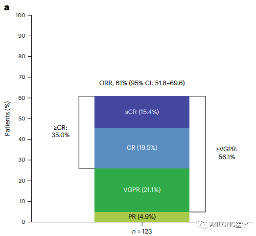 在2023年欧洲血液学协会会议上提交的队列A(n=123)的长期疗效数据显示,中位随访10.4个月时,接受Elranatamab-bcmm作为首次BCMA靶向治疗的患者ORR为61%,超过56.1%的患者达到了非常好的部分缓解率(VGPR)。在为期14.7个月的中位随访中,中位DoR、PFS及OS尚未达到。对于出现缓解的患者,在15个月时维持缓解的概率为72%。此外,研究中Elranatamab-bcmm具有可控的安全性。