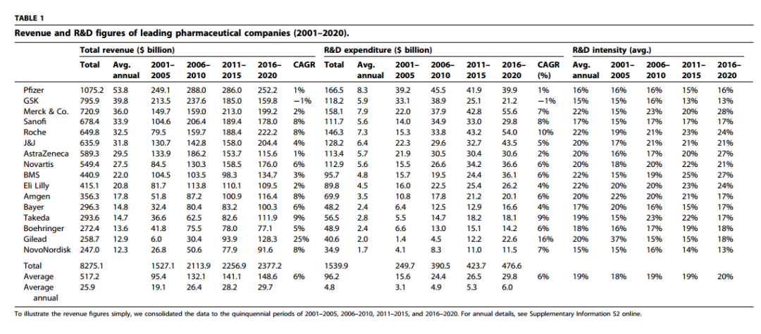 追求盈利,高额研发成本是最大的挑战。最近Drug Discovery Today刊登的研究结果表明,2001年至2020年期间,16家头部制药公司在药物发现和开发方面投资超过1.5万亿美元。随着时间的推移,研发支出从2497亿美元(2001-2005年)显著增加到4767亿美元(2016-2020年)。